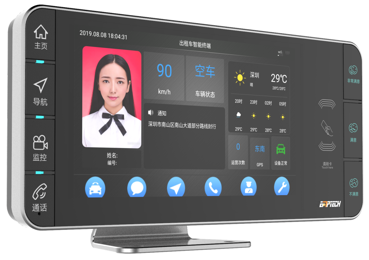 威九国际出租车车载智能终端基于Android操作系统,采用大屏嵌入式安装,由液晶显示区、状态显示区、星级显示区、服务评价区等组成,设备可安装给予网约化服务的APP应用,具有人机互动、视频播放、查看短信、电子证件显示、网约服务接单、扫码支付、智能导航、语音播报、服务评价等功能,并支持接入不同厂家的出租车基础硬件设备。